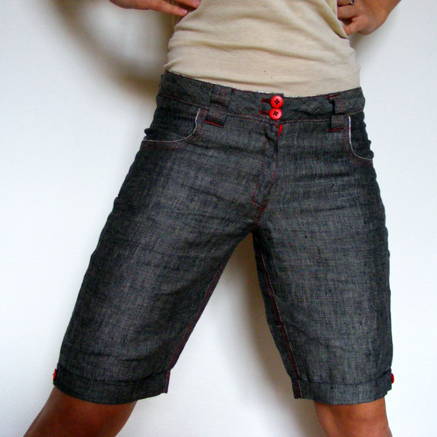 Lněné kraťasy ke kolenům jsou z šedého lnu a jsou šité červenými nitěmi, na boku nohavic jsou ozdobené červenými knoflíky