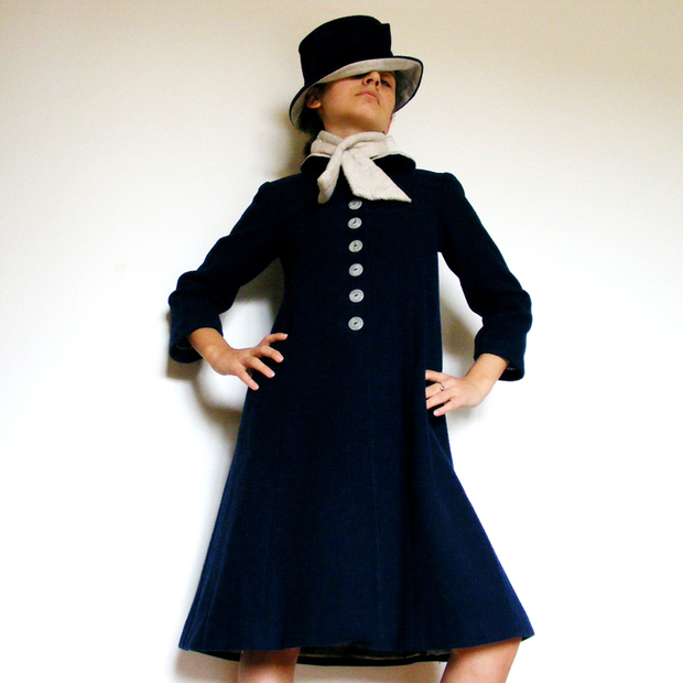 Dětský kabát je zhotovený z tmavě modrého flauše a je vypodšívkovavý prožkovanou podšívkou. Je doplněn šálkou a kloboučkem s mašlí.