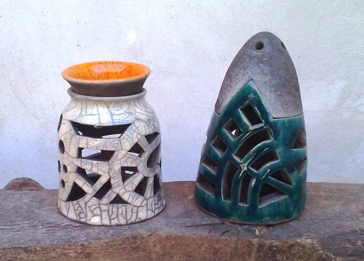 Obě výpal raku, glazované, vyřezávané, na svíčku.