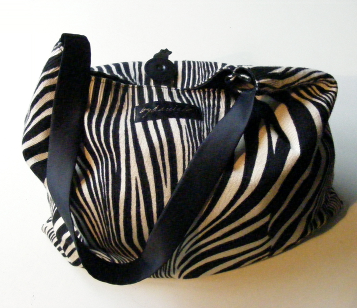 Kabelka je zhotovená z krásného viskózového pulovru s tiskem zebry, zapíní se na knoflík.
