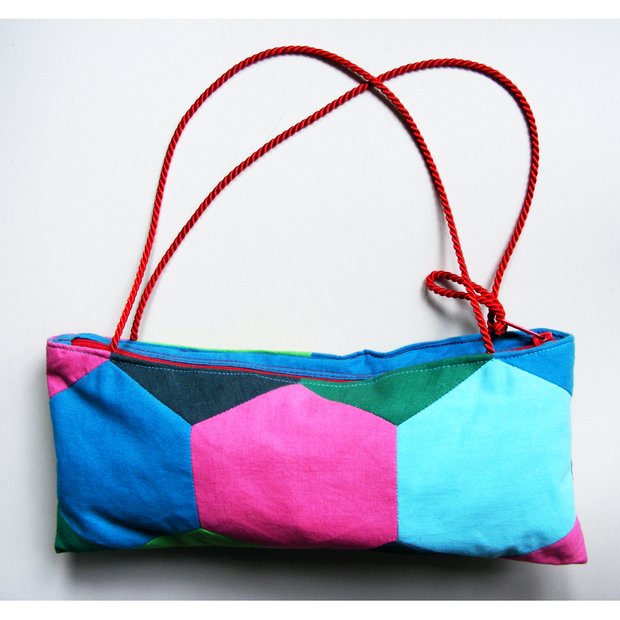 Patchworková kabelka z přírodních materiálů je zhotovená ruční technikou.