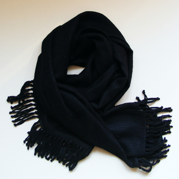 Bavlněná šála je z černé tkaniny s krásnou strukturou. Je doplněná ručně motanými třásněmi.