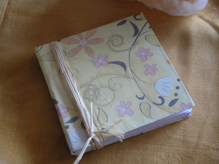Ručně dělaný notýsek o velikosti 9x9x1 cm je tvořen z tvrdé čtvrtky,bločku,obalen dekorativním papírem.