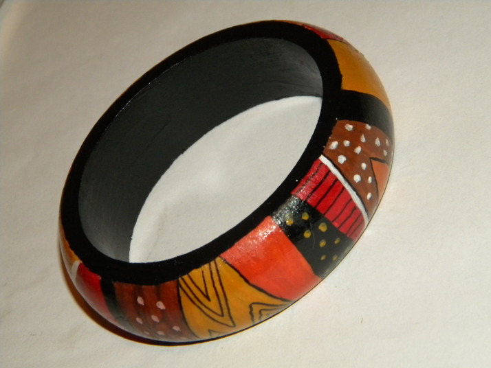 Náramek má vnitřní průměr 6,5 cm,vnější průměr 8 cm.Malovaný akrylovými barvami a lakovaný.