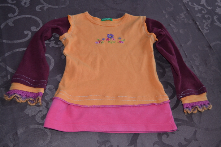 Tričenko původně pouze oranžové maličké tak na miminko, se mi hned líbilo, ale zůstalo nevyužité, dokud jsem nenadstavila rukávy i délku :)