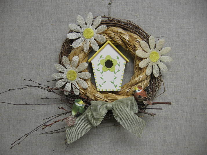 Jarní věnec, vyrobený ze 2 přírodních základů vložených do sebe, dřevěné budky, květů z kokosového vlákna a 2 ptáčků. Dekorace je dozdobena větvičkami břízy a kočiček a režnou mašlí.