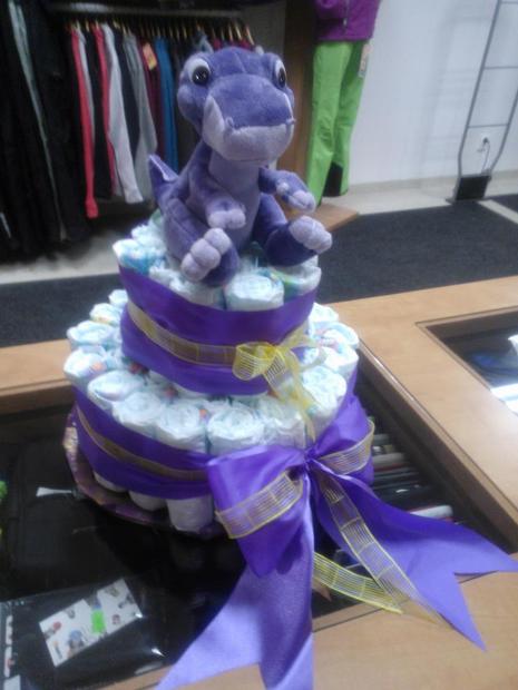 Jeden jednoduchý dětský plenkový dort v barvách lila s plyšákem.