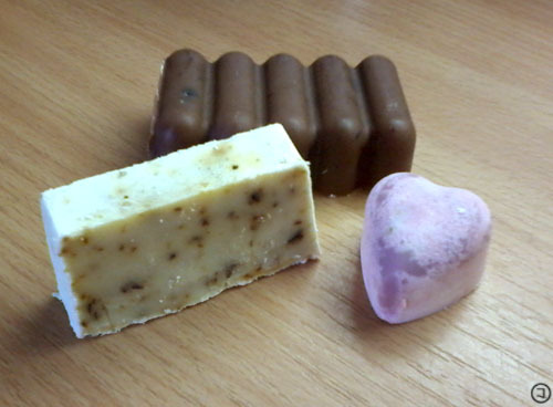 Mýdlo s kakaem, šampon s bezovými listy, levandulové mýdlo obarvené