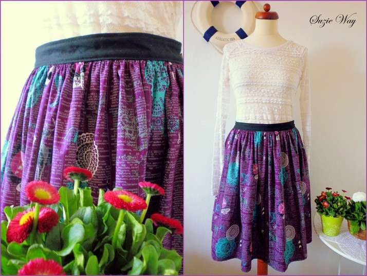 Sukýnka je ušitá z bavlněné látky s jeleny, krajkou a slovníčkem :) Je zřasená do pevného pásku a zapíná se na boku na zip a knoflíček :)