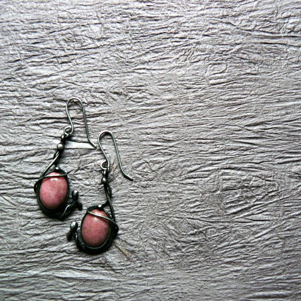Naušničky vystavé v galerii. V naušničkách jsou vsazeny kabošony rodonitu.