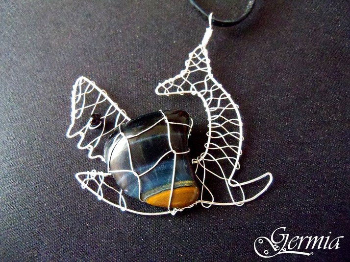 Šperk ve tvaru žraloka vyrobený z postříbřených drátků, černého rokajlu a polodrahokamu Sokolí oko.