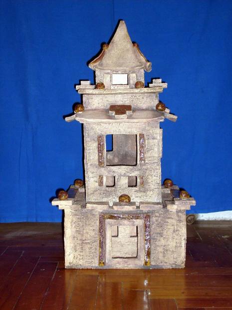 Pagoda na zahradu, vysoká celkem 75 cm, vážila 19 kilo a byla udělaná ze 4 kusů, které byly vypáleny zvlášť a potom sesazené.