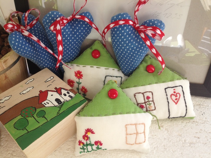 Jehelníčky ze 100 % bavlny, vyšívané.Krabičky ze dřeva, ručně malováno.