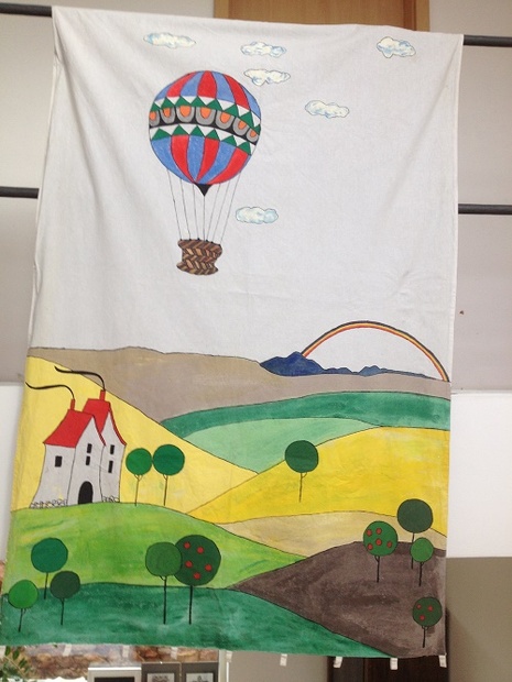 Malováno textilními barvami,podšito neprůsvitnou látko. Háčky na upevnění