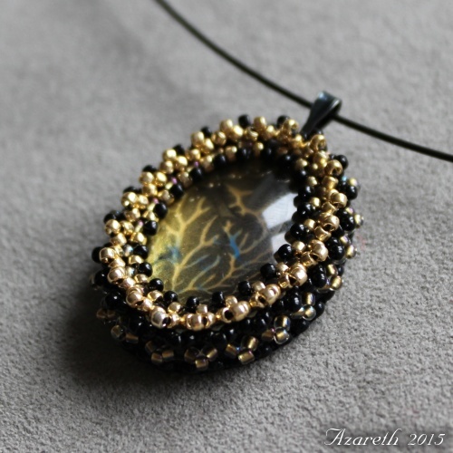 Krásný zlato-černý náhrdelník inspirovaný kouzly, králi a tajemstvím. Ukrývá v sobě tajemný skleněný kámen, ve kterém se pod různými úhly objevují různé odstíny zlaté a černé. Náhrdelník v sobě skrývá tajemné kouzlo, temnou eleganci. Zlaté korálky kolem něj tvoří přímo královskou ozdobu.