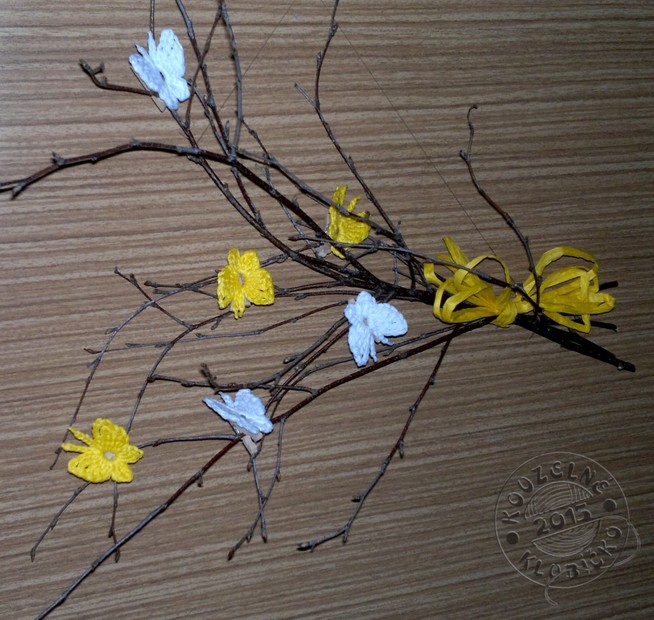 Větvičky ozdobené háčkovanými motýlky z bavlněné příze, připevněné na malých dřevěných kolíčcích.