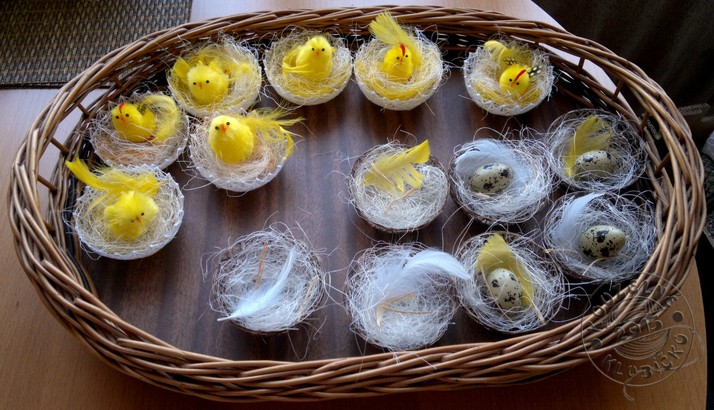 Hnízdečka a skořápky pro velikonoční dekoraci, vyrobené motáním z balněných přízí.