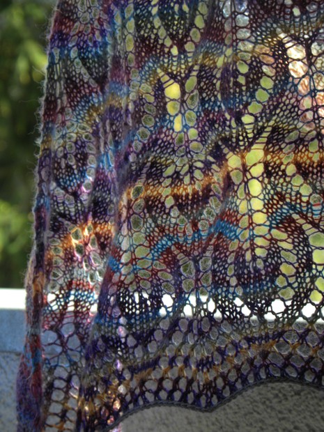 Pletený krajkový šátek v konečné podobě. Je jen z jednoho klubka, nádherně lehounký. V podstatě taková pavučinka kolem krčku :-)