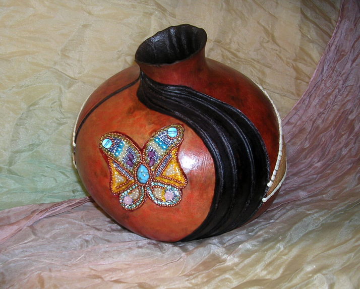 Ozdobená motýlkem vyšitým jabloneckými korálky. Oranžově a mahagonově mořená, zlatě přizdobená i s korálky.