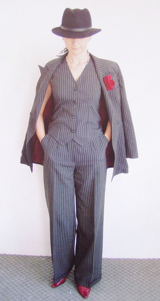 Kostým v pánském stylu oživený vínovou podšívkou a doplňky.