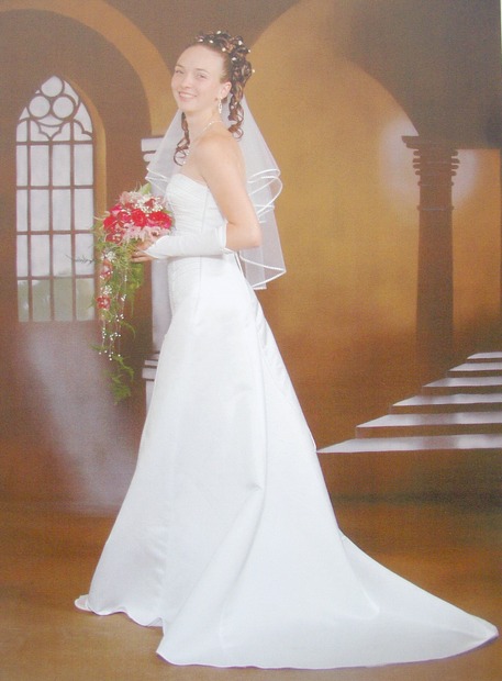 Šaty v bílé barvě,jednoduché linii. Bohatě zdobené perličkami v boční části.