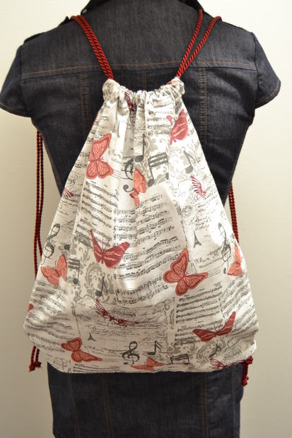 Sportovní vak na záda s motýly je o rozměru 50 na výšku a 40 na šířku. Jedná se o 100% bavlnu při gramáži 135 g/m2. Vak se dá v horní části klasicky stáhnout šňůrami, která zároveň slouží i jako ucha.