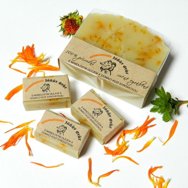 Vyrábíme i mýdla na zakázku dle přání zákazníka, k většímu odběru. Zde je vyrobeno mýdlo pro Jáňův dvůr s kozí syrovátkou z jejich kozí farmy a s měsíčkem lékařským. Malá hotelová mýdla jsou určena do pokojů pro jejich ubytované hosty.