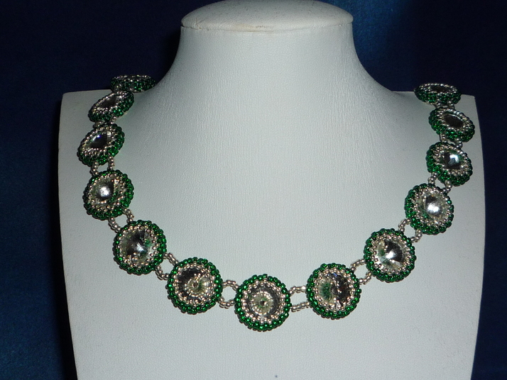 Náhrdelník vytvořený z čirých rivolek Swarovski obšitých rokajlem ve smaragdovém odstínu se stříbrným průtahem TOHO.