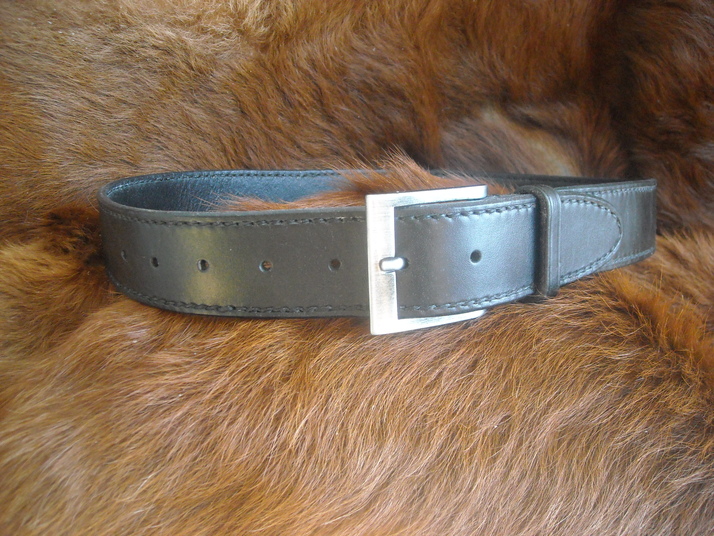 Opasek z černě probarvené kůže 4 mm silné, kompletně prošitý voskovanou černou nití. Šíře opasku je 40 mm.