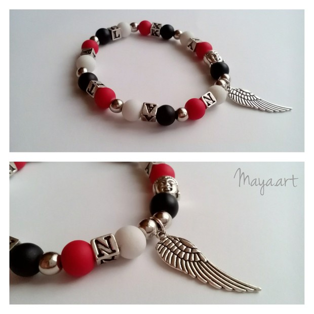 Náramek je vyroben z matných korálků bílé, červené a černé barvy doplněné o budhu, křídlo a stříbrné korálky s písmeny. Náramek je na pružence.