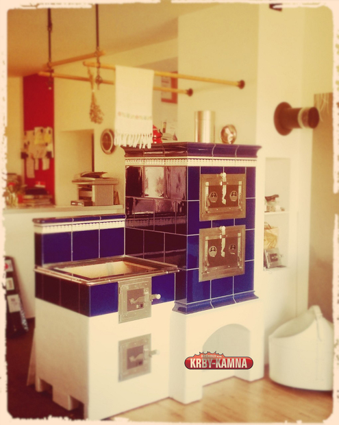 Jedna z mých posledních prací. Sporáček u nás na prodejně, klasická císařská modrá a ručně malované pásky pod římsou. www.kamnarstvi-podebrady.cz