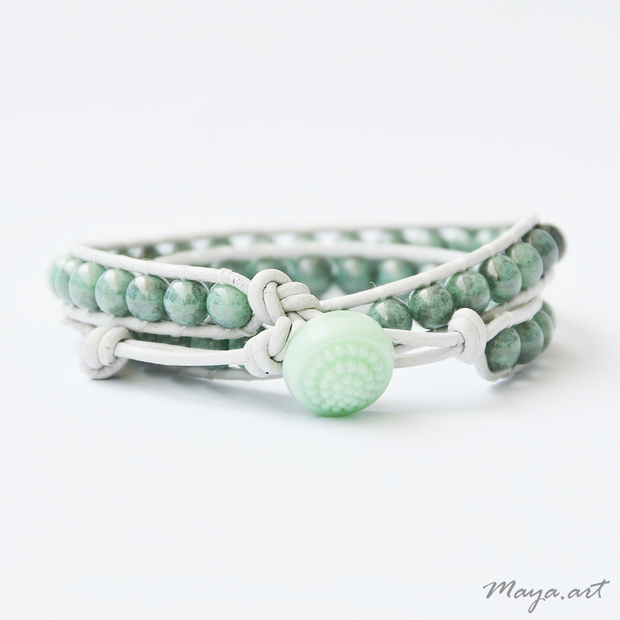 Zelený náramek je vyroben z bílé kůže, zelených tyrkysových kulatých korálků a zelenkavého knoflíku. Náramek tvoří dvě otočky kolem ruky.