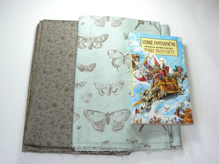 sv. zelená s nádechem do šedobéžové, postik v šedobéžové, vyfoceno s knihou velkosti A6