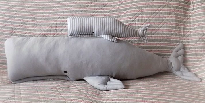 Velrybí rodinka je ušitá z bavlněných látek a vyplněná dutým vláknem.