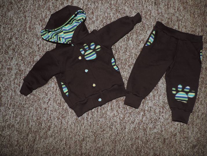 Tepláková souprava. Materiál:95% bavlna, 5% elastan. Barva: hnědá s modrým proužkem. Velikost: 74. Tato souprava je na objednávku. Dodání do 3 týdnů. Cena: 399 Kč.