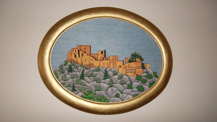 Obraz je zhotovený srtojní ručně vedenou výšivkou,velikost 70x90cm. Jako předloha byla použita fotka hradu Rabí.