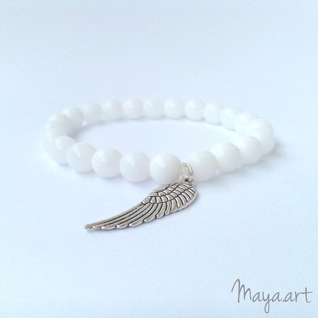 Náramek je vyroben z bílých skleněných korálků navléknutých na pružince doplněný o andělské křídlo.