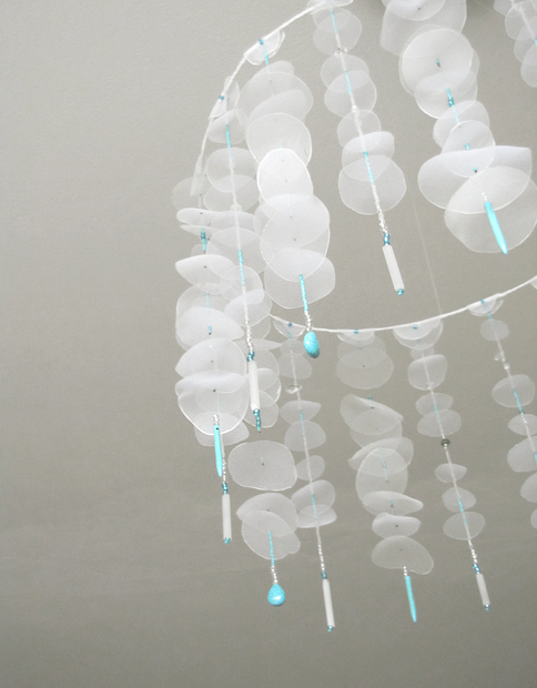 Mobilní závěs z lupínků bílé hedvábné organzy na dřevěném kulatém rámu obaleném rovněž hedvábím. Každý lupínek je malovaný a stříhaný.