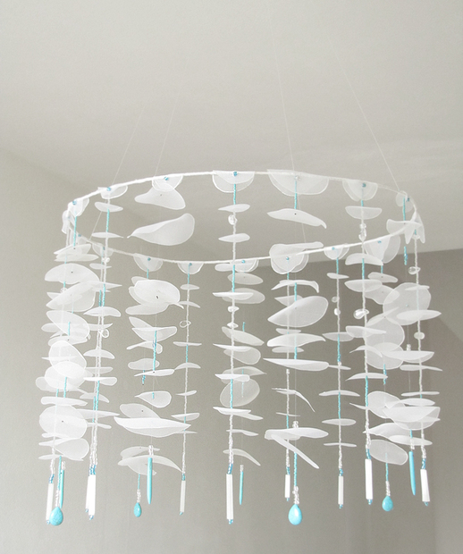 Mobilní závěs z lupínků bílé hedvábné organzy na dřevěném kulatém rámu obaleném rovněž hedvábím. Každý lupínek je malovaný a stříhaný.