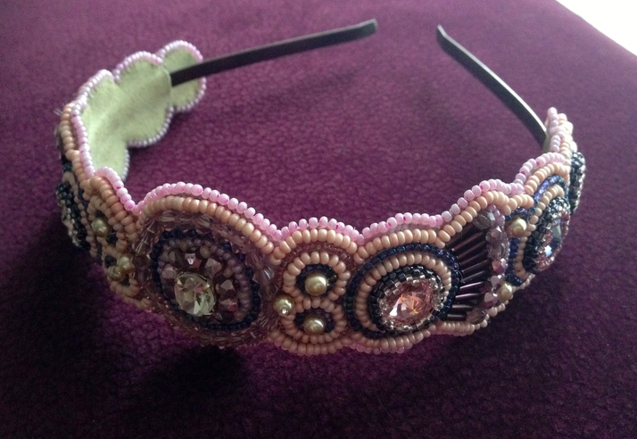 Hotová čelenka z korálků, perliček a krystalů swarovski.