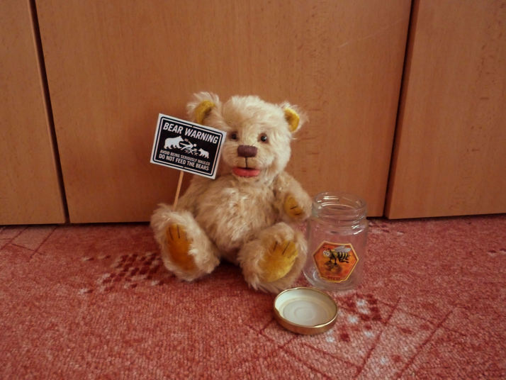 Mohérový 20 cm vysoký medvídek šitý v rámci swapu klubu medvědářek.