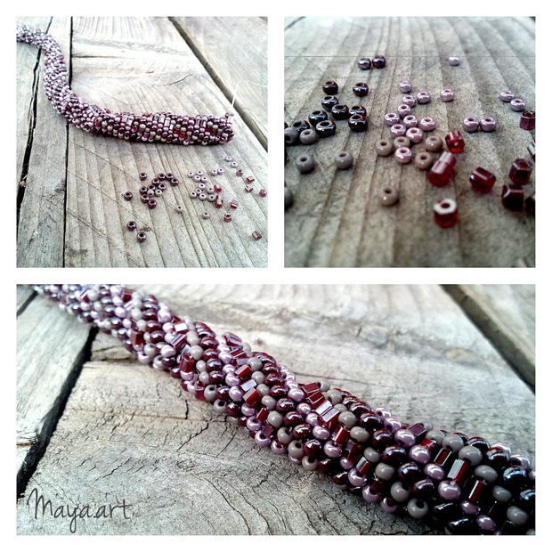 Šitý fialový náhrdelník byl vyroben šitím dutinky z rokajlu šedé a fialové barvy různých velikostí.