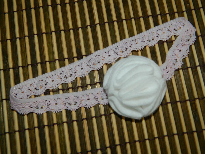 Růžová čelenka s bílým květem, obvod 34 cm. Čelenka je na pružné gumě a přizpůsobí se i hlavě o obvodu 55 cm.