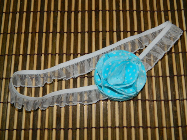 Čelenka s modrým puntíkem průměr květu 5 cm, obvod gumičky s krajkou je 39 cm. Guma je velice pružná.