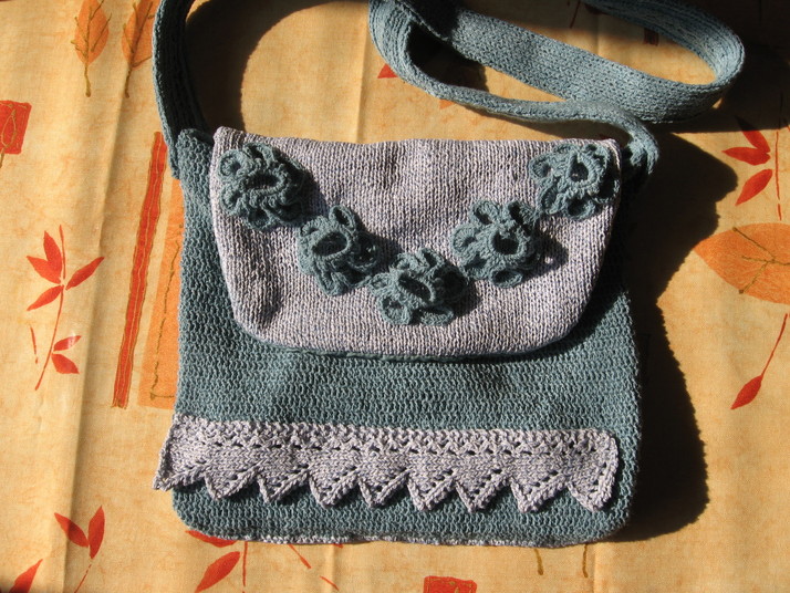 šedomodrá háčkovaná i pletená kabelka s vystuženým dnem s vloženou látkou opatřenou dvěma malými kapsičkami, zapína ní na truko