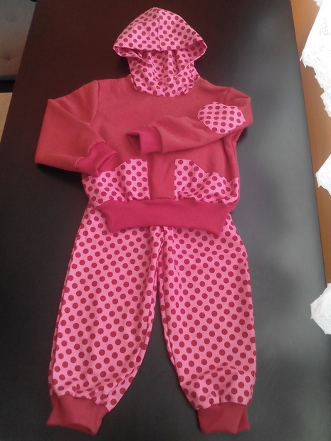 Bundička na zip s kapuckou a kapsičkami. Tepláky v pase na gumu. Nohavice také do gumy pro pohodlnější pohyb. Materiál: Bundička - teplákovina, tepláčky - bavlna. Velikost 98 - 104 Cena soupravičky 410,-kč