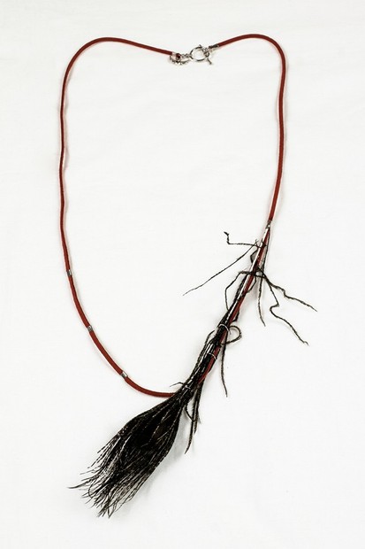 červená kůže, zapínání palička/kruh, detail srdce s křídlem, paví pero, stříbrné prvky na kůži