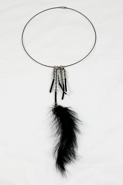 Lanko, černá kůže, křišťál, pírko, srdíčko swarovsky