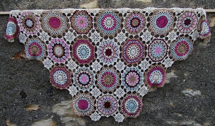 Originální šátek - pléd jsem vyrobila spojováním háčkovaných motivů z příze - bavlna s viskozovou nitkou, která se na světle leskne.