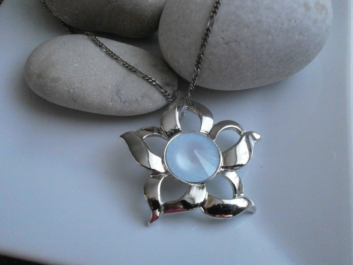 Větší přívěs Slunečnice- materiál Rhodium v kombinaci se Swarovski- barva White Opal. Závěsné očko na zadní straně.Možno v různých barvách.